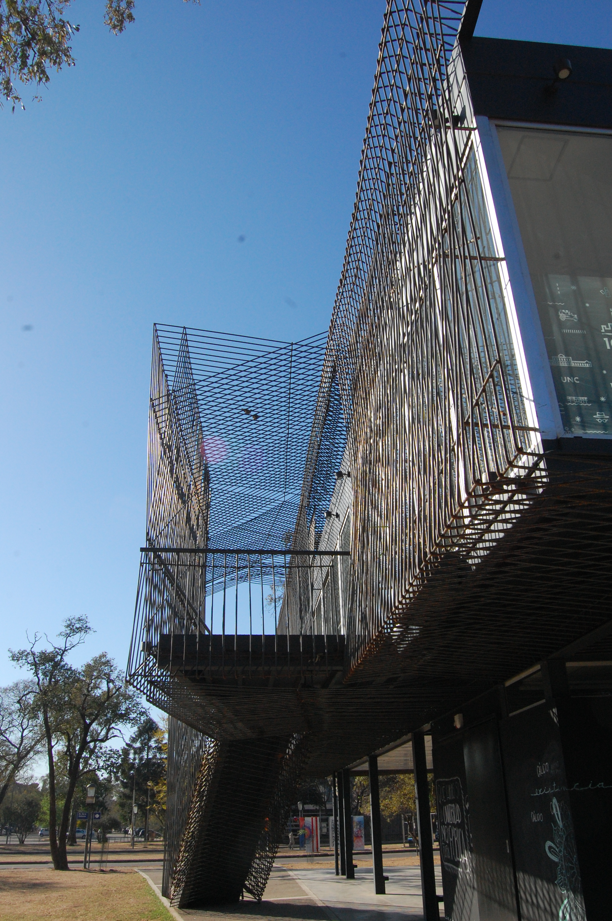 Pedestrian walkway- Ciudad Las Varillas. Within the proposed general strategy which contemplated regulatory aspects, recovery of public spaces and enhancement of heritage buildings, we built this pedestrian walkway to cross a water channel that runs through the city. It materialized in soft iron rods, building a repeated metal basket along the canal. This walkway, as well as pergolas made with the same resource and language, were part of exploration still in force on this material -bent iron- that encompassed objects and structures that incorporate both the concept of “unfinished” as a value and the unconventional use of this material. This technique was also proposed in recent works such as the Headquarters of the Student Federation of the National University of Cordoba (UNC) 2018.